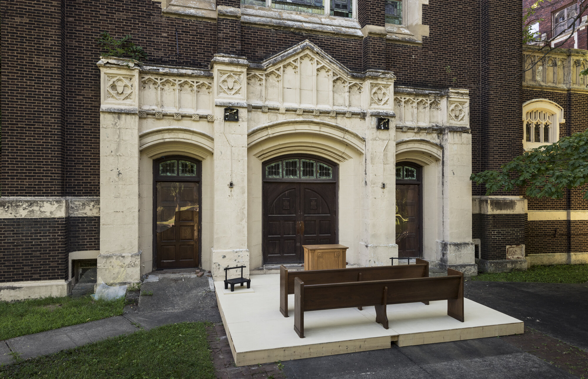 Materials include the following: Hand constructed seats inspired by the Grandfather Chairs of the Dan people (Cameroon, West Africa) built from reclaimed oak. These seats were placed on either side of a pulpit set before recovered oak pews. St. Mark’s stands as a majestic witness.